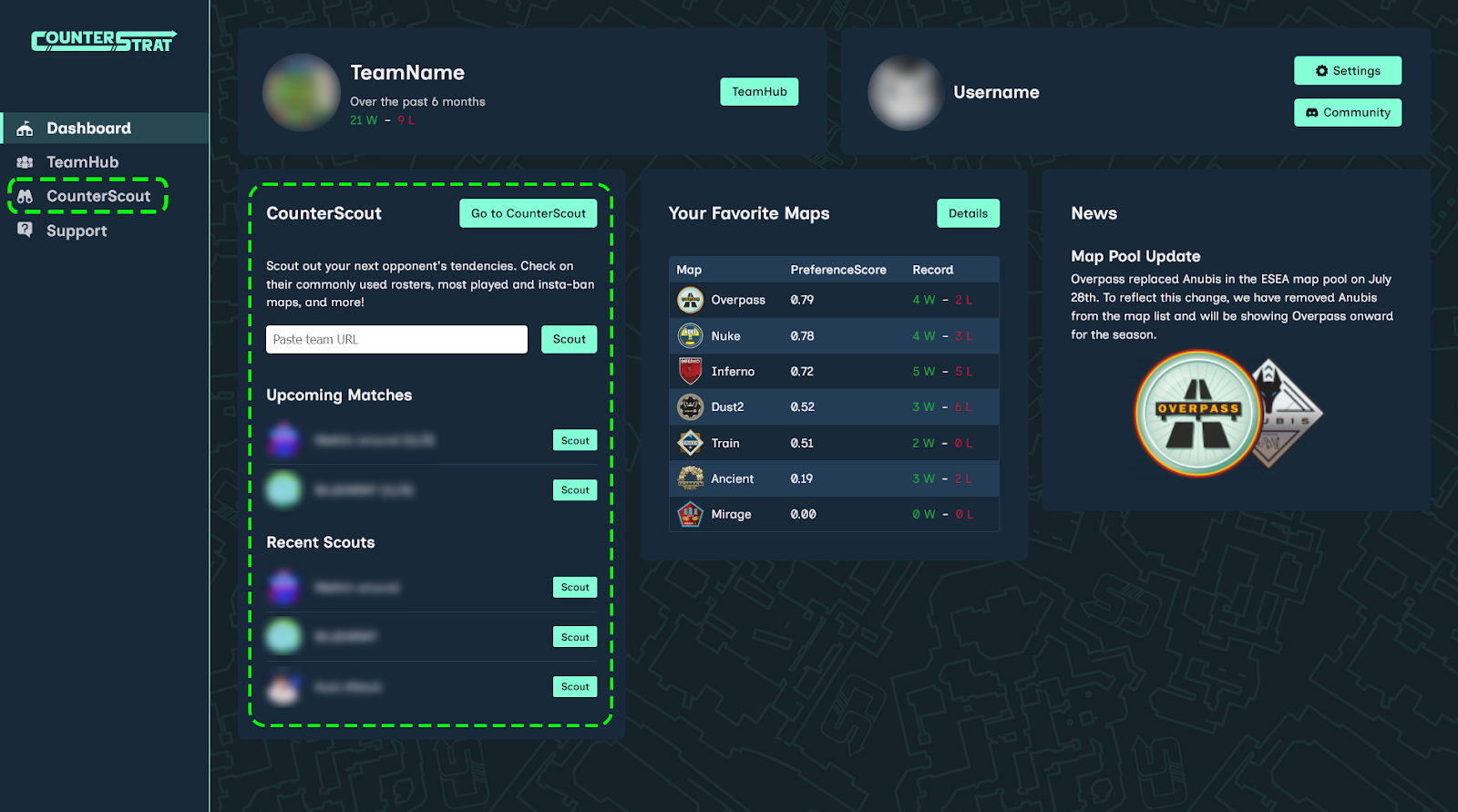 To load a team into Veto Analyzer, use CounterScout, available on your dashboard and as a standalone page. On your dashboard, CounterScout automatically loads your upcoming Faceit matches and displays any recent scouts.