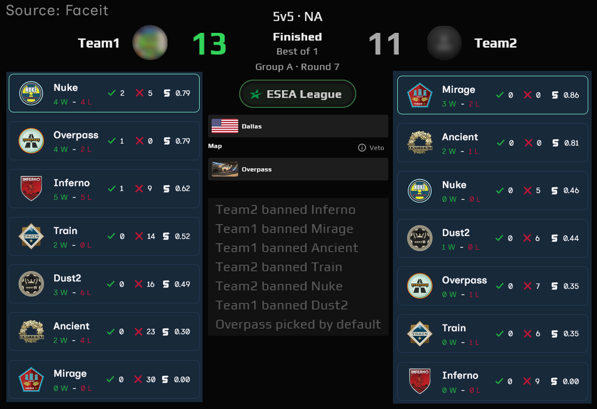 - With Dust and Overpass left over, Team1 is able to ban Dust; leaving Overpass as the map.
