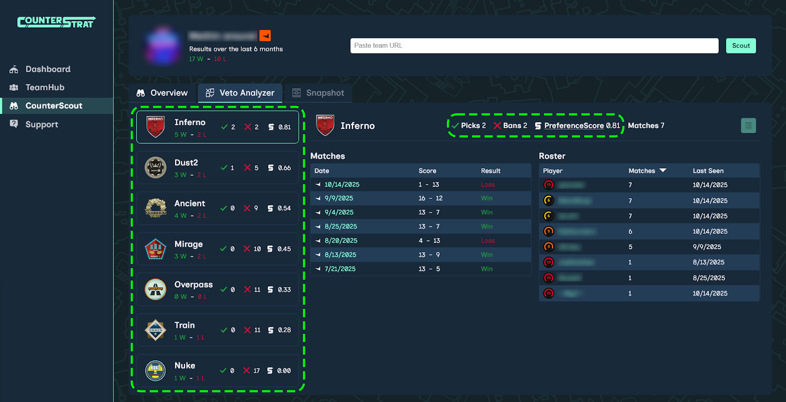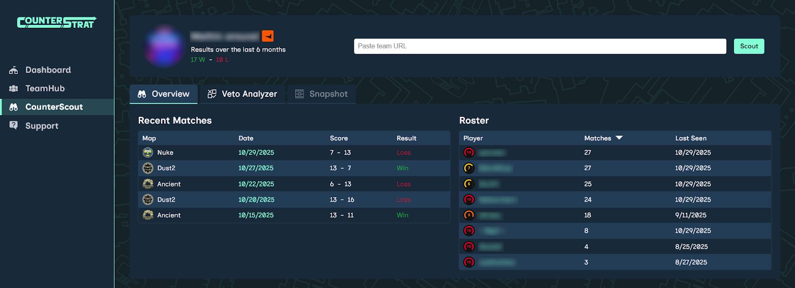 Using CounterScout, you can load enemy team data, review recent matches and roster activity, and explore their map-by-map performance in the Veto Analyzer tab. With this information, you can predict veto outcomes, identify weaknesses in the enemy map pool, and develop a smarter veto strategy; giving you a strategic edge before the first round even begins.