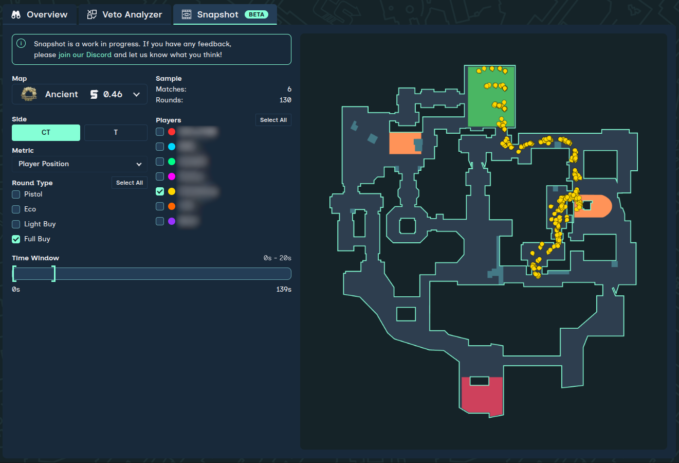 Snapshot is a new beta feature within CounterStrat that solves this by giving teams a high-level tactical overview of opponent behavior. Instead of watching rounds one by one, Snapshot overlays data from multiple demos and rounds at once, letting patterns emerge instantly.